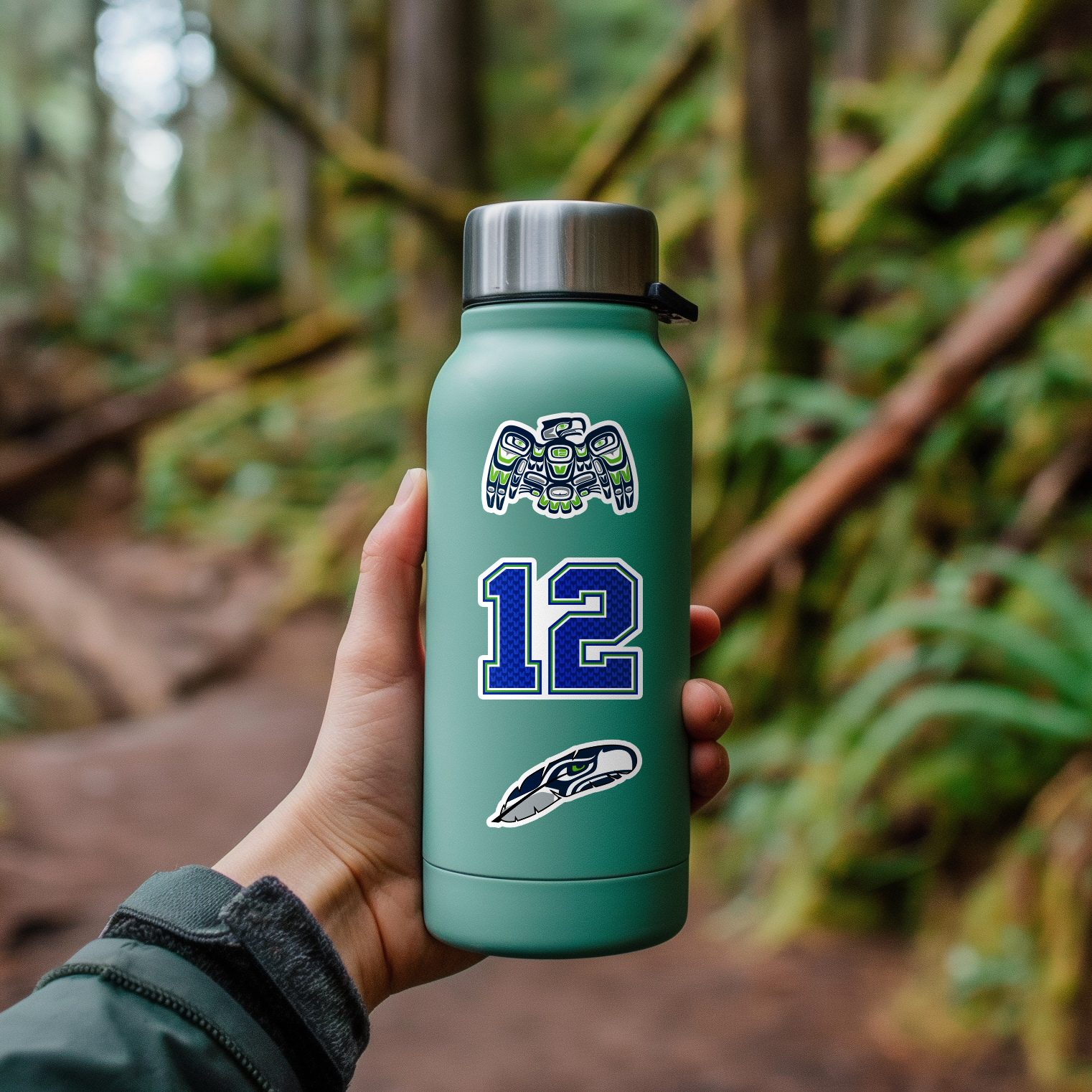 This set includes 4 of our small Seahawks stickers. These stickers will fit well on your water bottle, laptop, tablet, phone case, bike, skateboard, snowboard, hard hat, helmet, or anywhere else you choose!